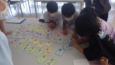 9月14日(水)に4年生は、阿賀町社会福祉協議会、阿賀黎明高等学校2年生のみなさんと一緒に防災学習を行いました。写真で行っているのは「なまずの学校」というゲームです。自身などの災害で発生する様々なトラブルを紙芝居形式で出題し、それを解決するのにもっともふさわしいと思う「なまずカード」を出して、得点をゲットするゲームです。高校生のみなさんと話し合ってカードを決め、得点が発表されると盛り上がりが見られました。