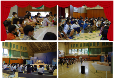 9月30日(金)に体育館に舞台を設置して演劇鑑賞会が行われました。劇団風の子による「風の少年シナド」の上演でした。子どもたちは、迫力のある動きや音に驚きつつも見入っていました。本物に触れることのできた良い機会となりました。