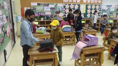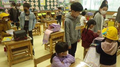 入学して間もない新1年生の朝の支度を手伝う6年生のみなさんです。まだまだわからないことがたくさんある新1年生に優しく手を差し伸べていました。その姿がずいぶん大人っぽく見えました。