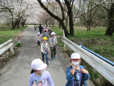 4月18日(月)に、1,2年生が一緒に麒麟山公園へ春を探しに出かけました。公園までの道中には、スイセンやスミレなど花がたくさん咲いていました。公園のサクラも見頃でした。子どもたちは地域の方々へ元気にあいさつしたり手を振ったりして嬉しそうに歩いていました。
