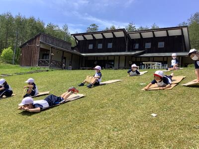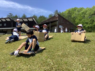 1,2年生のコースはハーバルパークでした。様々な草花を観察しながら歩き、ハーバルパークでは段ボールでそりすべるをして元気に活動しました。