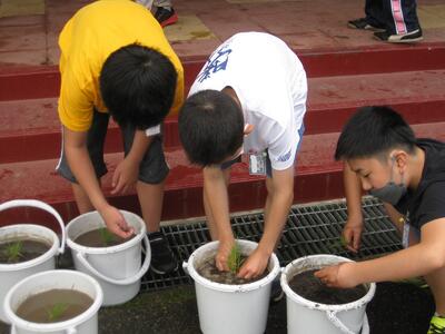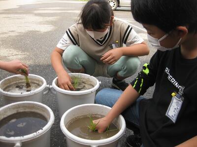 5月31日(火)に5年生が田植えをしました。今回はバケツに稲を植えるバケツ稲です。講師の方から稲の特徴や植え方を教えていただき、泥の感触を味わいながらひとつひとつ植えていました。稲の成長をよく観察し、おいしいお米ができることを願って世話をしていきます。