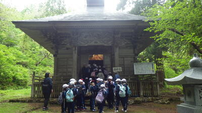 3,4年生は津川地区を巡りました。払川から西山日光寺まで歩き、春の植物や日光寺の歴史について知ることができました。