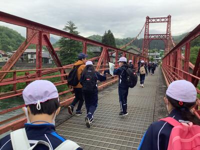 5,6年生は鹿瀬地区を巡りました。鹿瀬支所から、鹿瀬橋(赤い吊り橋)、鹿瀬駅前、新潟昭和、旧鹿瀬小学校と阿賀野川 深戸橋梁(鉄橋)を巡り、豊かな自然や歴史に触れることができました。