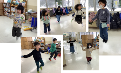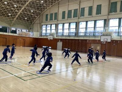 体育で、縄跳びに取り組んでいます。前跳び、駆け足跳び、あや跳び、交差跳び、二重跳びなどに挑戦しています。また、長縄も毎朝練習してがんばっています。