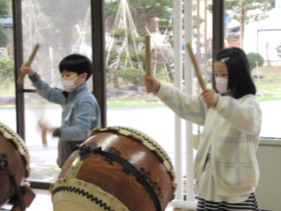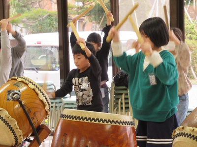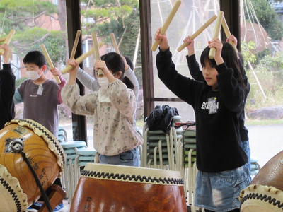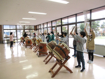 3年生の音楽の授業で、伝統的な音楽に親しむ学習があります。津川民謡保存会の方を講師としてお招きし、太鼓をたたく体験をしました。祭り囃子の音が響き渡りました。